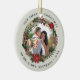 Elegant and modern personalized First Christmas ceramic ornament with beautiful Christmas wreath. Personalize the product with the year, the family name and two of your favorite wedding photos.