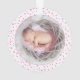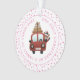 Our first Christmas as parents car woth gifts pink photo acrylic Ornament. The front features a car with a deer and gifts and the text "Our First Christmas as a family of three" and a border of pink polka dots and the back the photo of the baby with the same border. Change photo and add your details!