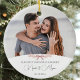 Our First Christmas Engaged Ceramic Round Custom Photo and Name Ornament — This elegant personalized xmas tree ornament is the perfect keepsake gift for any couple getting ready to tie the knot. Both the front and back of the decoration are identical, with personalization templates allowing for a custom photo, date of engagement or year in a simple serif typeface, and names in a lovely handwritten calligraphy script, along with a blush pink watercolor festive foliage and bow accent.
