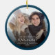 This Christmas tree ornament is a perfect keepsake gift for the newly engaged couple. The design offers and photo with a dark blue border and overlay text for the couple's names and year.