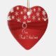 *** PLEASE NOTE that the ribbon and jewels are works of art and are not real. Remember your special day with this beautiful red and white snowflakes, heart-shaped ornament. You can customize the text to say whatever you wish. It also matches the Red and White Snowflakes wedding collection shown below.