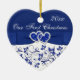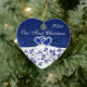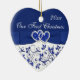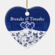 This royal blue and white floral ceramic heart shaped ornament has a PRINTED blue ribbon and bow with a pair of FAUX glitter and diamond jewel PRINTED joined hearts on it. It would make a nice keepsake of your special day, or a great gift for the newlyweds, or change the text and give them as gifts to your wedding party attendants or special people as favors. If you need help customizing this, or if you want something changed, email niteowlstudio@gmail.com.