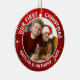 Commemorate your FIRST CHRISTMAS with two photos on this double-sided keepsake ornament featuring a red and white starburst background with the title OUR FIRST CHRISTMAS and your custom text on the front and a full-bleed photo on the back. Contact the designer via Zazzle Chat or makeitaboutyoustore@gmail.com if you'd like this design modified or on another product.