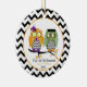A Halloween ornament featuring two owls sitting on a tree branch holding hands. Female owl is orange and male owl is green. Both have black and whtie chevron bellies. Background is black and white chevron. Personalize with your name. Look for matching items at Jill'sPaperie.