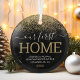 New home glass christmas ornament featuring a trendy black background, a elegant gold glitter waterfall design, the cute saying 'our first home', your name(s), your new address, and the year.