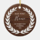 This simple and rustic Christmas ornament features a classic white laurel wreath on a brown wood look background, and says "our first home" in trendy handwritten script, with room for you to add your address. The perfect housewarming gift or holiday remembrance for the new homeowner.