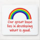 Hope keeps us going when everything else tells us to quit, so why not express yourself to the world with a hope design featuring the quote: Our great hope lies in developing what is good.
