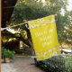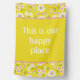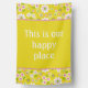 Bright and sunny house flag features a retro pattern of white flowers with pink and green centers on yellow background. Center yellow text box with customizable "This is our happy place" text
