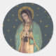 Our Lady of Guadalupe round sticker sheets featuring the original tilma image of St. Juan Diego enhanced with a golden halo and a midnight blue starry background. Perfect for gift wrapping, greeting cards, bookcovers and more.