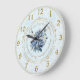 Blue rose wall clock on a light blue damask background. Gold colored floral trim. Calligraphy reads: " Oh, Most Beautiful Flower of Mount Carmel, fruitful vine, the splendor of heaven".