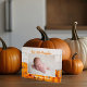 This beautiful, modern Thanksgiving newborn photo block features a photograph of your sweet new baby under the words Our Little Pumpkin in orange. This pretty autumn photograph with trendy white wood behind the patch of pumpkins is an elegant birth gift for Halloween or Thanksgiving.