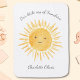 This cute baby blanket is decorated with a yellow smiling sun and "Our Little Ray Of Sunshine" in stylish script typography. It has a sun pattern on the back.