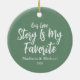 Add festive cheer to your holiday décor with Our Love Story Is My Favorite Ornament, featuring a joyful green design and a personalized photo of the happy couple. Perfect for celebrating love and laughter during the season, this charming keepsake makes a thoughtful gift or treasured addition to your Christmas tree. This ornament is a part of a winter holiday collection with coordinating items available. We encourage you to explore the full set to create a perfectly matched party celebration.