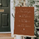 Modern minimalist wedding sign featuring script font that says "our love story" with a heart. The background color is terracotta.