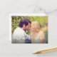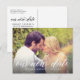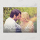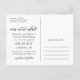 Romantic and understated, this wedding date change postcard features a lush full-bleed couple photo with flowing white brush script reading "our new date" across the lower half. The couple's names and updated date appear in clean white sans-serif below. The mailable postcard reverse includes all essential mailing and event details. All text and the photo are fully customizable.