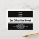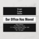 At the top, there's a display image you can replace with your company logo. In the center, there's black display text for a custom message (shown: Our Office Has Moved). At the bottom, there are lines of display text you can edit to share the new address. The postcard is black and white.