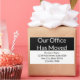 Our Office Has Moved is in white text at the top. The bottom has black display text you can edit to show your company's name, new address, and phone number. All text can be edited or deleted.