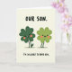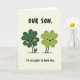 This design shows two smiling four-leaf clovers standing close together on a soft parchment-colored background, their faces turned slightly toward each other as if sharing a private joke 💚. The left clover is a deep emerald green with rounded leaves and a gentle stem, while the right clover is a lighter chartreuse with slimmer stalks that make it look a bit more youthful ☘️. Both have dark, friendly eyes, rosy peach blush on their cheeks, and wide crescent smiles with a single tooth showing, which gives them an affectionate, buddy-like charm. Subtle gradient shading across each leaf adds a velvety look and a touch of depth without making the scene feel busy. Centered near the top, the text “OUR SON.” appears in dark green, standing out clearly against the pale background. Near the bottom, “I’M SO LUCKY TO HAVE YOU.” is also centered in matching dark green, balancing the layout and framing the characters. The two clovers are the only figures in the scene, with plenty of open space around them so your eye stays on their warm expressions and close, companionable posture. The final detail is the gentle shading on the leaves and the small peach blush marks that sit just beneath their eyes.