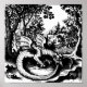 Drawing of a medieval-style dragon biting his tail in a forest.