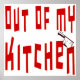 Out of My Kitchen Funny Saying in red letters with a meat cleaver in the letter n.