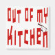 Out of my Kitchen saying for cooks with an attitude, moms with Momitude and those slaving over a hot stove everywhere. Fun food slogan in blood red scratchy letters with a meat cleaver in the 'N'
