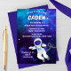 Make your child’s celebration truly out of this world with this vibrant space-themed birthday invitation! The design features a deep blue-purple galaxy background filled with stars, giving the perfect cosmic atmosphere for any little astronaut. A cheerful cartoon astronaut floats weightlessly near the bottom, adding a playful and adventurous touch kids love.