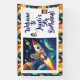 A fun birthday party banner that you can personalize with name, age and photos for a little boy's space themed birthday party with a cute retro comic book style illustration of a little boy flying o a rocket through space! Just add all the party's details in the personalize area!