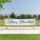 Select from indoor or outdoor, with or without grommets. Shown in White with Blue text "Happy Hanukkah" in a fancy script with two Gold looking swirls of stars on each end.