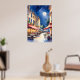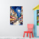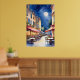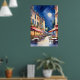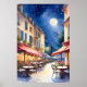 Poster of a bright, full moon, a charming street lined with cozy cafes and vibrant flowers is illuminated, inviting passersby for a night out. The cobblestone pathway is adorned with patio tables and chairs, creating a serene and romantic atmosphere.