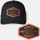 Overall, the combination of the geometric patch, the refined line art, and the natural leather texture gives the hat a rugged yet polished outdoor aesthetic ideal for a campground, campsite brand, or adventure-themed apparel.