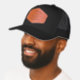 This trucker hat features a laser-engraved leather patch shaped as a soft-edged hexagon. At the center of the patch is a minimalist line-art camping emblem: a tent framed by two fir trees, a crescent moon above, and flowing landscape lines below. The illustration is clean, balanced, and modern, using thin black strokes for a crisp, flat style.