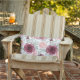 This outdoor accent throw pillow is shown with a lovely garden of roses print design.