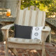 This outdoor throw pillow is shown in a black color with a White accent panel with faux buttons.