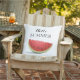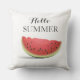 This outdoor throw pillow is shown in a cute Hello Summer watermelon print on a white color background.