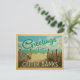 This Greetings From Outer Banks vintage postcard design features a sandy beach with a beautiful turquoise ocean water and above the sea, a blue sky with billowy white clouds. In vintage travels style.