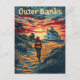 A serene and captivating depiction of a sunset at the Outer Banks, North Carolina, highlighting its expansive beaches and tranquil coastal beauty. The design features the sun dipping below the horizon, casting warm hues across the sky and reflecting off the gentle waves. Silhouettes of iconic Outer Banks landmarks, such as lighthouses and dunes, enhance the nostalgic ambiance of the scene. Rendered in a vintage style, this artwork evokes the peaceful and picturesque atmosphere that makes Outer Banks sunsets a cherished experience.