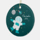 This cute boy's personalized round ceramic photo ornament has an out of this world space theme! The background has a dark teal color with lots of yellow, white, and gray stars in the background. There is an astronaut on the bottom with a gray moon with a star flag at the top. There is a rocket ship floating to the right of the moon. On the right, you can easily customize the name and the year. On the backside, you can easily add your own photograph.