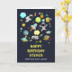 Birthday greeting card with a cute and colorful pattern with all kinds of outer space themed elements. Images include astronauts floating around in their white space suits. Stars and planets and cool little rocket ships, spaceships, and satellites. Fun and crazy design.