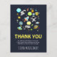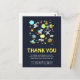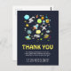 Party thank you postcard with a cute and colorful pattern with all kinds of outer space themed elements. Images include astronauts floating around in their white space suits. Stars and planets and cool little rocket ships, spaceships, and satellites. Fun and crazy design.
