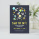 Birthday save the date card with a cute and colorful pattern with all kinds of outer space themed elements. Images include astronauts floating around in their white space suits. Stars and planets and cool little rocket ships, spaceships, and satellites. Fun and crazy design.