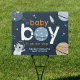 Houston, we have a baby boy! Countdown to blast off! Greet your guests to your outer space themed baby shower with this fun yard sign. This design features planets, stars, rocket ships, astronauts, galaxies, satellites and more!