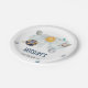 Celebrate your child's special milestone with this magical outer space themed birthday paper plates. Featuring imaginary planets, moon and stars in navy and gold colorway. These Outer Space Birthday Galaxy Sun Moon Stars and Planets Paper Plates are perfect for a simple birthday party. The modern whimsical design showcases a navy-blue watercolor background adorned with a yellow vibrant sun, smiling grey moon, pastel-colored planets, and gold scattered glow stars.