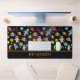 A fun colorful Outer space desk mat. Design features fun cartoon astronauts, rockets, aliens. stars, moon and planets all on a black milky-way photographic background. Personalize by amending the name. A perfect way to add color and fun to a child's desk.