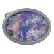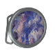 A silver-tone oval belt buckle framing an original fluid art by WestJack Studio. Blue tones are well complemented by the purple and silver accents. Designed in Canada.