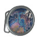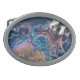 A silver-tone oval belt buckle framing an original fluid art by WestJack Studio. Blue tones are well complemented by multicolored accents. Designed in Canada.