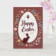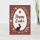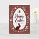This design shows a softly shadowed off-white oval like a decorated egg set on a deep maroon background, creating a cozy frame for a spring greeting. Centered inside the oval, a flowing handwritten-style message sits in a dark ink tone, giving the words a gentle, affectionate presence. Just below the text, a sleek dark bunny silhouette rests near the bottom edge, as if pausing close by with a calm, companionable air 🐰. Around the oval, leaf sprigs in muted teal and soft ochre weave together with pale pink, creamy white, and light orange flowers, like a wreath gathered for someone special 🌷. Small scattered dots in matching hues add extra texture and a light, confetti-like touch without crowding the layout. At the top of the oval, a small patterned egg detail nestles above the lettering, tying the theme together. The maroon field stays solid and smooth, while the floral border forms a ring of petals and leaves that curves evenly around the central egg shape.