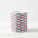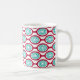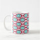 This mug has a mid-century modern design of beet-colored ovals connected into chains with turquoise concentric circles made of circle rings inside. Same design, different colors? Message me.