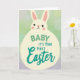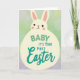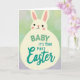 This greeting card shows a simple long-eared bunny-like figure with a rounded, egg-shaped cream body centered on the front 🐰. Small black dot eyes, a tiny orange-red nose, and soft pink cheeks give it a gentle, affectionate look, like it’s quietly sharing a sweet moment with the viewer. Tall upright ears with pale pink inner details rise above the head, adding a soft, friendly tone. Across the middle of the cream body, a celebratory message is placed in teal-green lettering, standing out clearly against the light shape. The words sit neatly centered, reading like they’re part of the character itself, like a sign held close in a caring gesture. Behind it, the background blends muted pastel greens with a hint of violet, dotted with large blurry light circles that feel like floating bubbles 🌷. A faint texture runs through the backdrop, and the bunny’s rosy cheeks and teal text remain the sharpest details against the hazy, glowing spots.