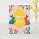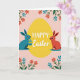 This design shows a balanced Easter scene with two long-eared rabbits facing a large yellow oval at the center 🐰. The oval acts like a sunny sign, with white greeting text placed neatly across its middle. On the left, a teal rabbit holds a smaller decorated egg close to its chest, its dark eyes and soft smile angled toward the message as if sharing a quiet moment with a friend. The egg is patterned with yellow stripes and white dots, adding a festive touch without crowding the layout. On the right, a reddish-orange rabbit mirrors the pose, looking inward with a gentle, companionable expression that suggests a sweet exchange 🐇. Both rabbits stand on matching color platforms that anchor them against a pastel pink background. Around the edges, simple spring florals and leafy sprigs in red, teal-blue, and green frame the scene, with small petals and stems spaced evenly like a border 🌷.