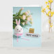 This card features a smooth white bunny figure centered against a pastel blue background, with tall ears lined in pink and round eyes that seem to meet yours with a gentle, friendly gaze 🐰. Soft blush cheeks and a small heart-shaped nose add a tender, affectionate look, like it’s quietly offering a sweet hello. Around the base sits a pale pink ribbon tied into a neat bow, giving the scene a gift-like touch. To the right, a small gold cube dusted with fine glitter catches the light and adds a warm sparkle beside the bunny 🐇. Next to it, a white arrow-shaped sign points inward, carrying a short Easter greeting in simple black lettering placed neatly across the center. Behind everything, out-of-focus spring flowers with thin green stems and soft pink-and-white petals fill the background like a gentle garden backdrop. The lighting stays even and soft, and the blurred blossoms sit low and slightly left, with the arrow and gold cube grouped to the right.